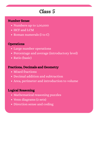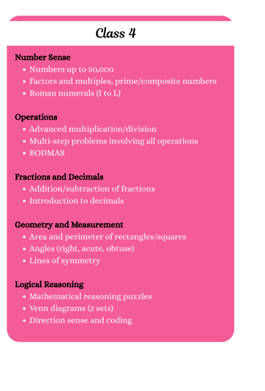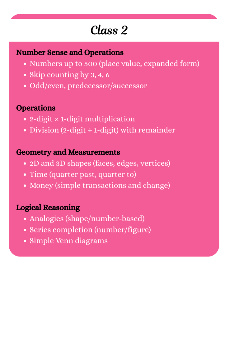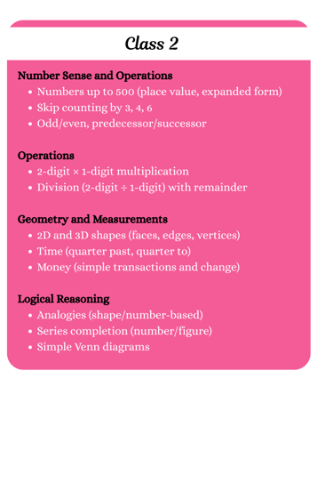 This syllabus is carefully designed to challenge young minds and enhance their mathematical thinking. It includes slightly advanced topics beyond regular school learning, encouraging logical reasoning, analytical skills, and problem-solving – essential for success in Math competitions and beyond.