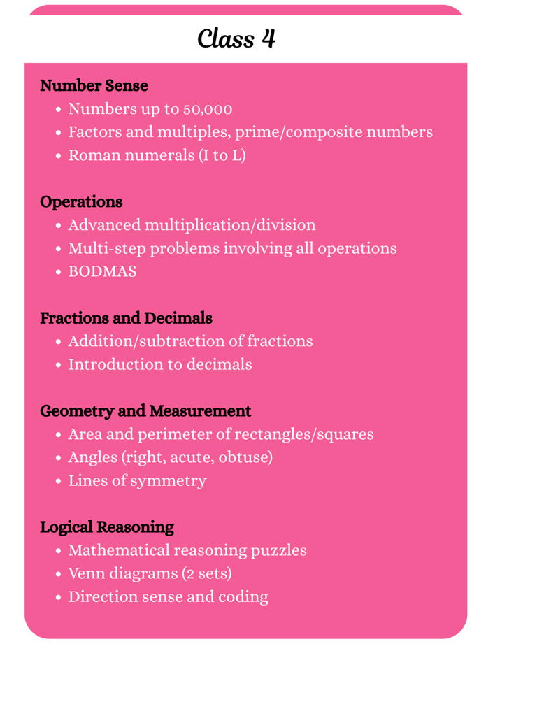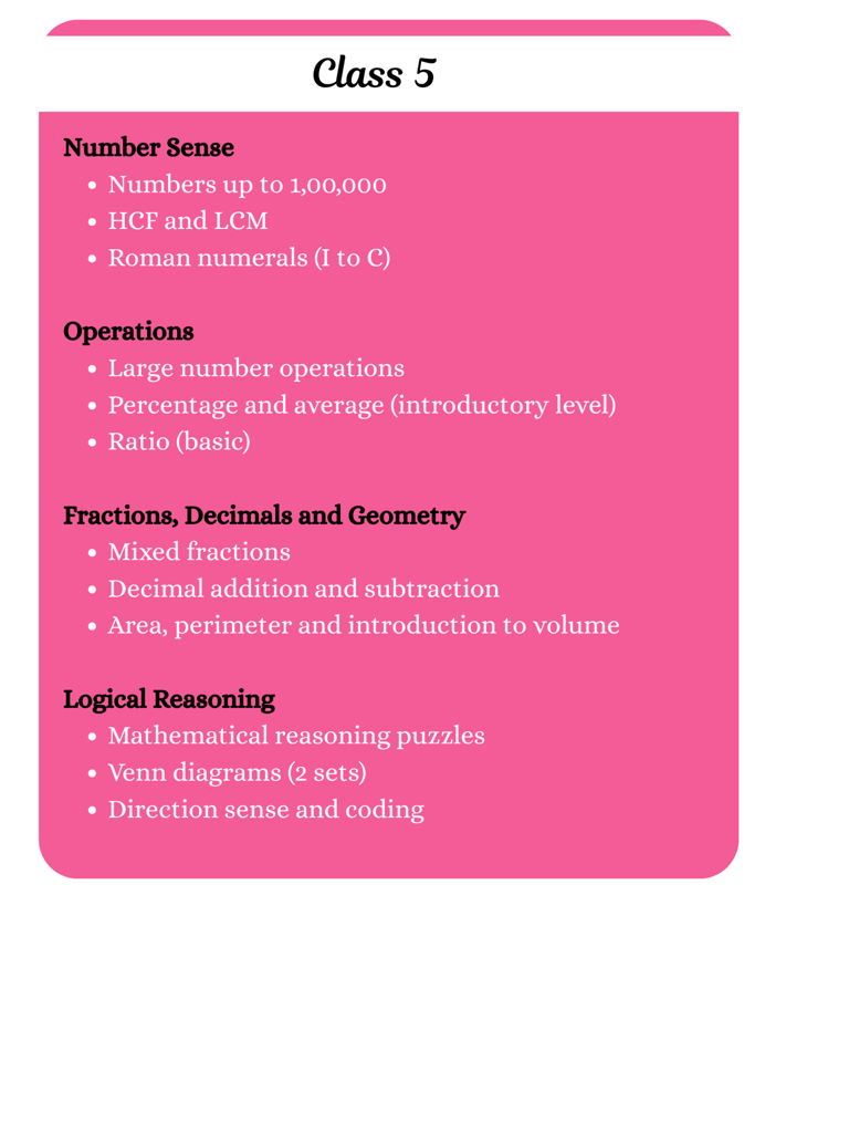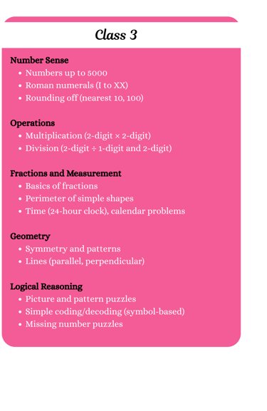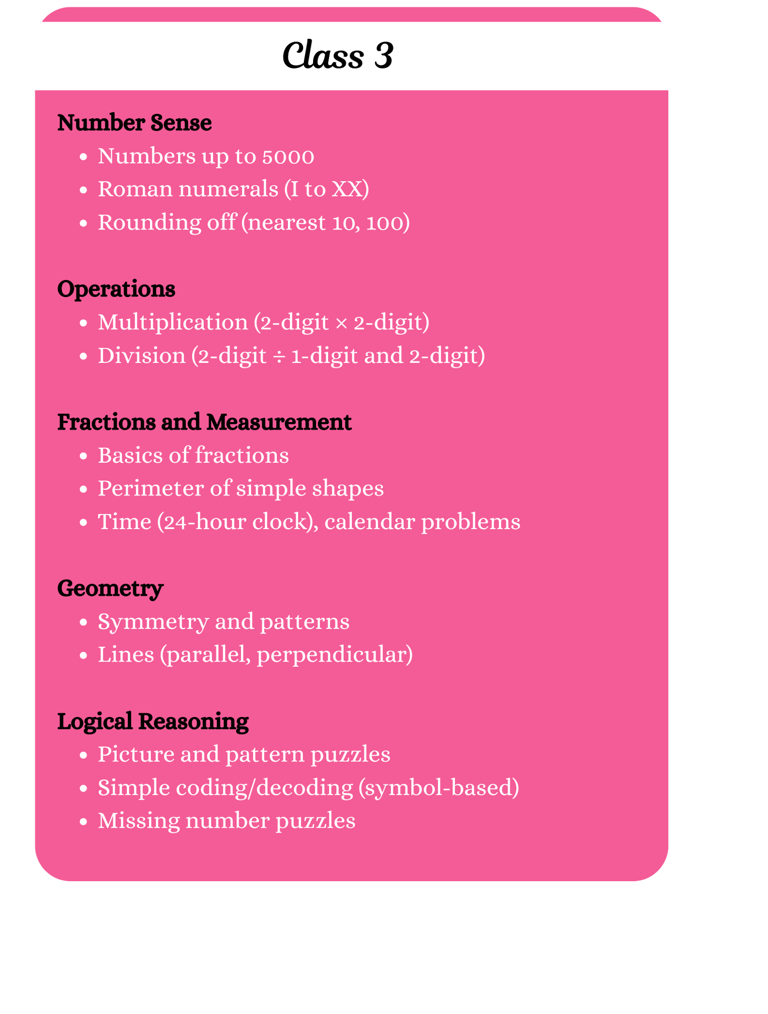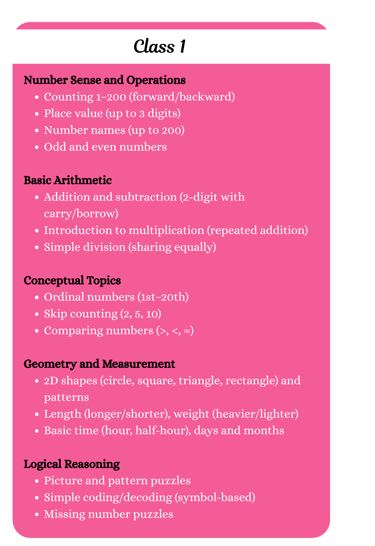 Get ready to explore Math in a whole new way! Our Olympiad syllabus is packed with exciting challenges, puzzles, and logical problems that will sharpen your skills and make learning fun.